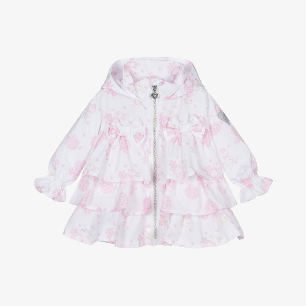 Younger girls white and pink coat from Little A by A Dee, made in silky smooth fabric with a charming floral and bunny print. This delightful coat has tiered ruffles, decorative bows and a practical hood for fun outdoor adventures. The soft cotton-blend lining ensures comfort, while the metal zip fastening allows for easy dressing.
