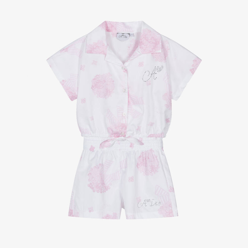 White and pink shorts set for girls by A Dee, made in soft and breathable cotton. Patterned with pretty flowers and striped bows, the short-sleeved shirt has an open collar and pearlescent buttons. It has an elasticated waist with a knotted bow detail. The matching shorts have diamanté branding on the leg for a touch of sparkle.