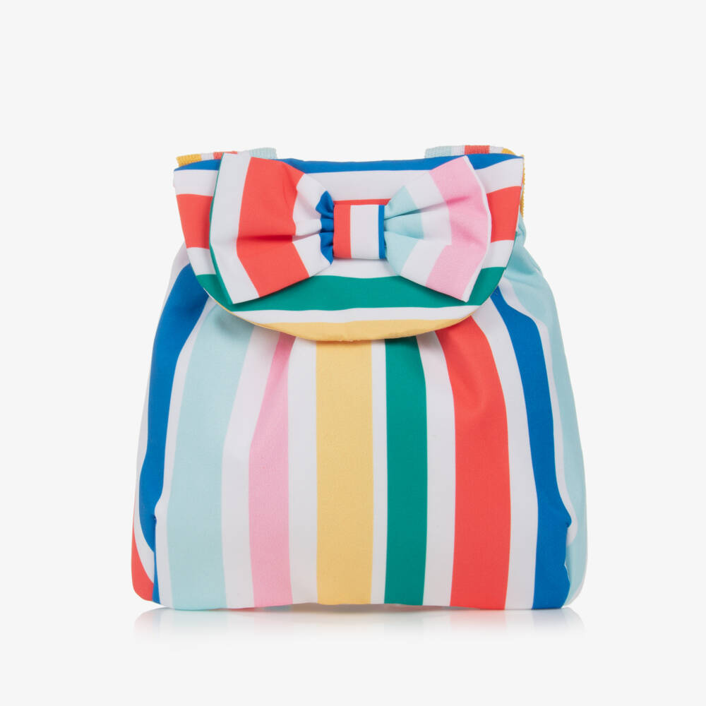 Quirky white and pink striped backpack for girls, by A Dee. Patterned in fun rainbow colour stripes, the front flap has an adorable bow appliqué and fastens with a single popper. It comes with striped straps to guarantee a comfortable, secure fit.