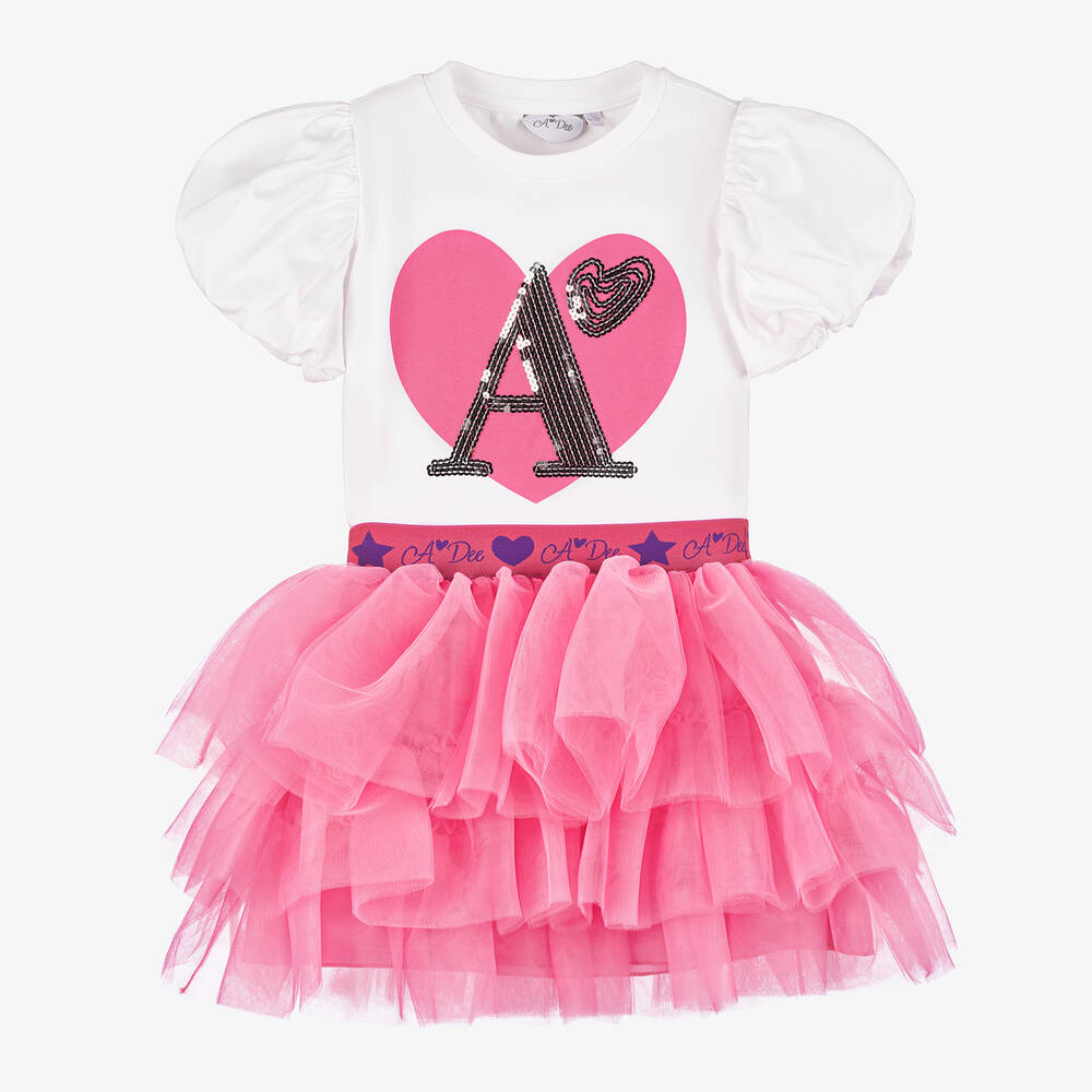 Lovely white and pink tutu skirt set for girls by A Dee. The cotton jersey top has statement puffed sleeves and a cute pink heart, embellished with sparkling silver sequins. The voluminous pink tutu skirt is formed by tiers of fine tulle and adds impact to the look. It is lined with a soft, silky fabric and has an elasticated waist, completing the outfit with comfort.