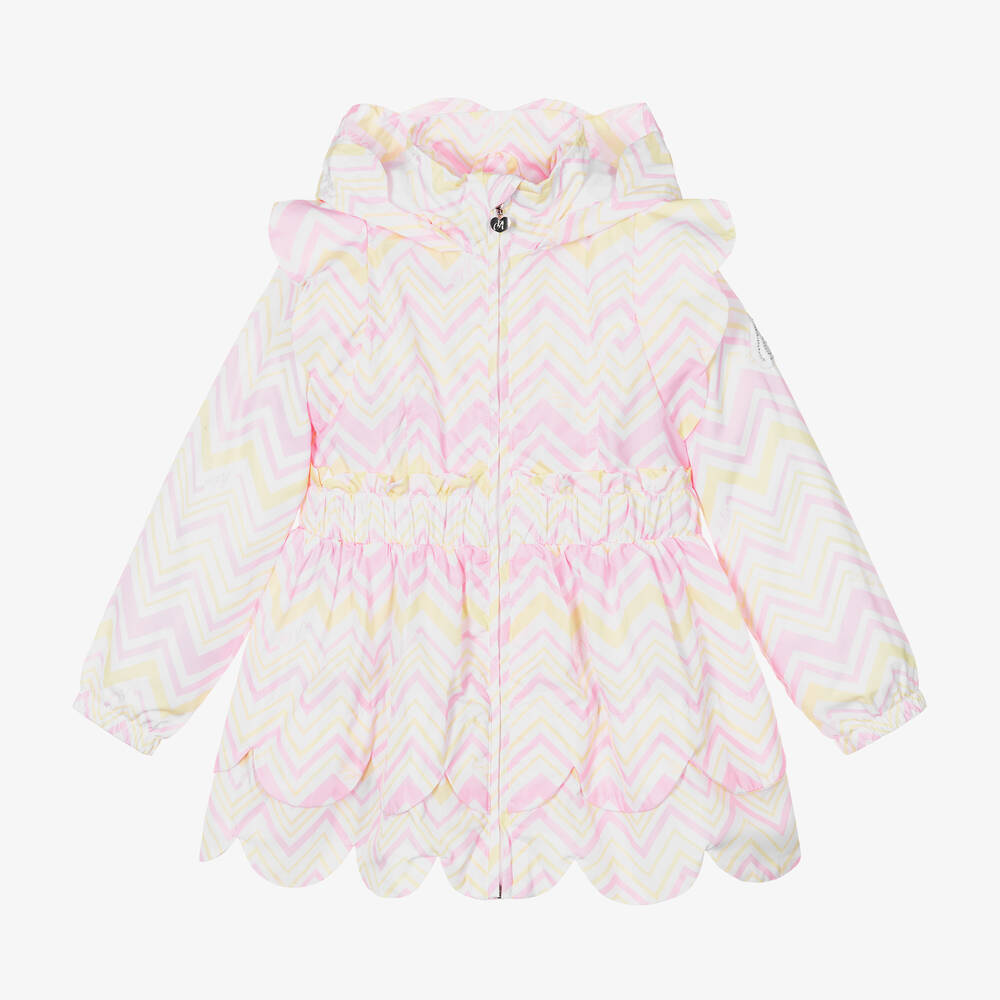A white hooded coat for girls by A Dee, patterned in a pink and yellow zigzag logo design. Made in a silky smooth fabric and lined in soft jersey. this practical design has concealed side seam pockets and elasticated cuffs. The frilled waist is gently elasticated for a comfortable fit and for a pretty finish, there is a layered scalloped hem and trim over the shoulders. The concealed zip on the front has a silver heart-branded pull, with a sparkling diamanté logo patch on one sleeve adding an extra designer detail.