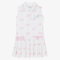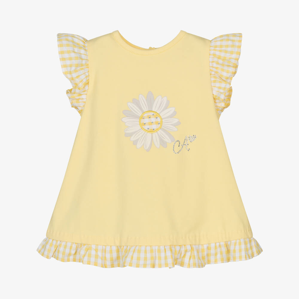 Yellow dress for younger girls from Little A by A Dee, made in soft and stretchy jersey with cotton trims. The sweet daisy print on the front is complemented by pretty gingham frills on the sleeves and hem. It has popper fastenings on the back and can be worn with a pair of matching knickers that pull-up over her nappy.
