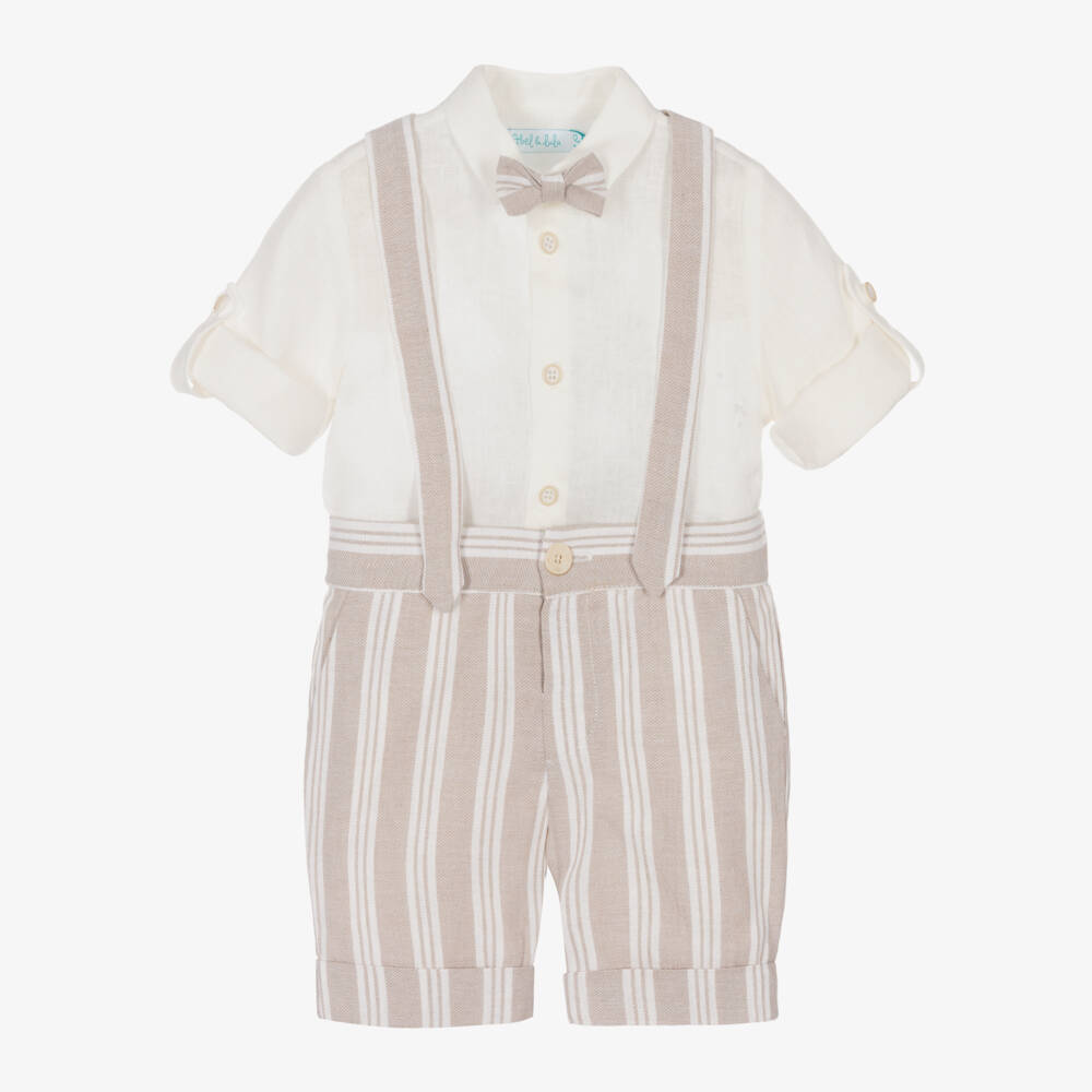 Smart white and beige striped shorts set for little boys, by Abel & Lula. Woven in a beautifully soft and lightweight linen blend, the shirt has button fastenings on the front, a crisp pointed collar and sleeves which can be worn rolled up or turned down. Matching beige striped shorts complete this co-ordinated look, finished with cross-over button straps. This cute set comes with a matching striped bow tie, which simply hooks onto the shirt button, to complete the lovely little boys outfit.