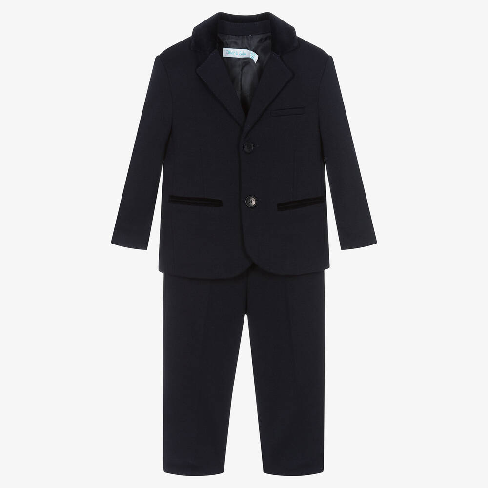 A smart navy blue suit for little boys by Abel & Lula. Soft and comfortable to wear, it is made in a stretchy viscose-blend jersey, with a silky satin lining. The button-fastening jacket is vented on the back for ease of movement, and the trousers have an adjustable waist for an ideal fit. Both pieces have faux pocket detailing, with velvet trims for an elegant finish.