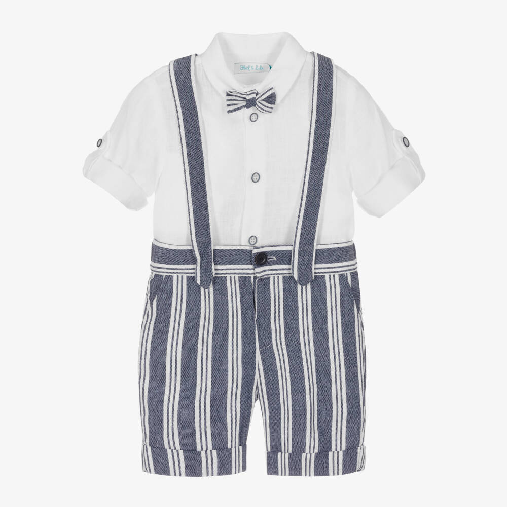 Smart white and blue striped shorts set for little boys, by Abel & Lula. Woven in a beautifully soft and lightweight linen blend, the shirt has button fastenings on the front, a crisp pointed collar and sleeves which can be worn rolled up or turned down. Matching blue striped shorts complete this co-ordinated look, finished with cross-over button straps. This cute set comes with a matching striped bow tie, which simply hooks onto the shirt button, to complete the lovely little boys outfit.