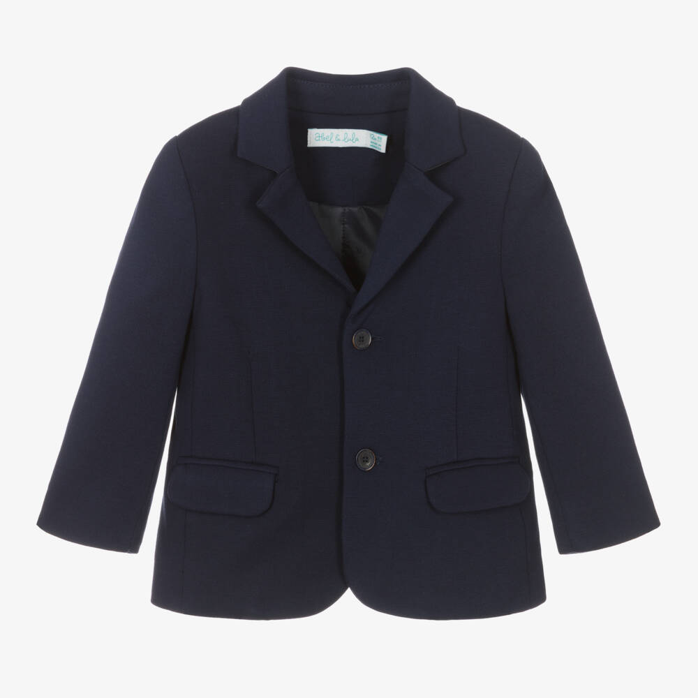 A navy blue blazer for little boys by Spanish brand Abel & Lula, made in a soft Milano jersey knit. Ideal for any special occasion, it has a smart lapel collar and front button fastenings. Classically styled, there are sealed front flap pockets on the front and button detailing on the cuffs.