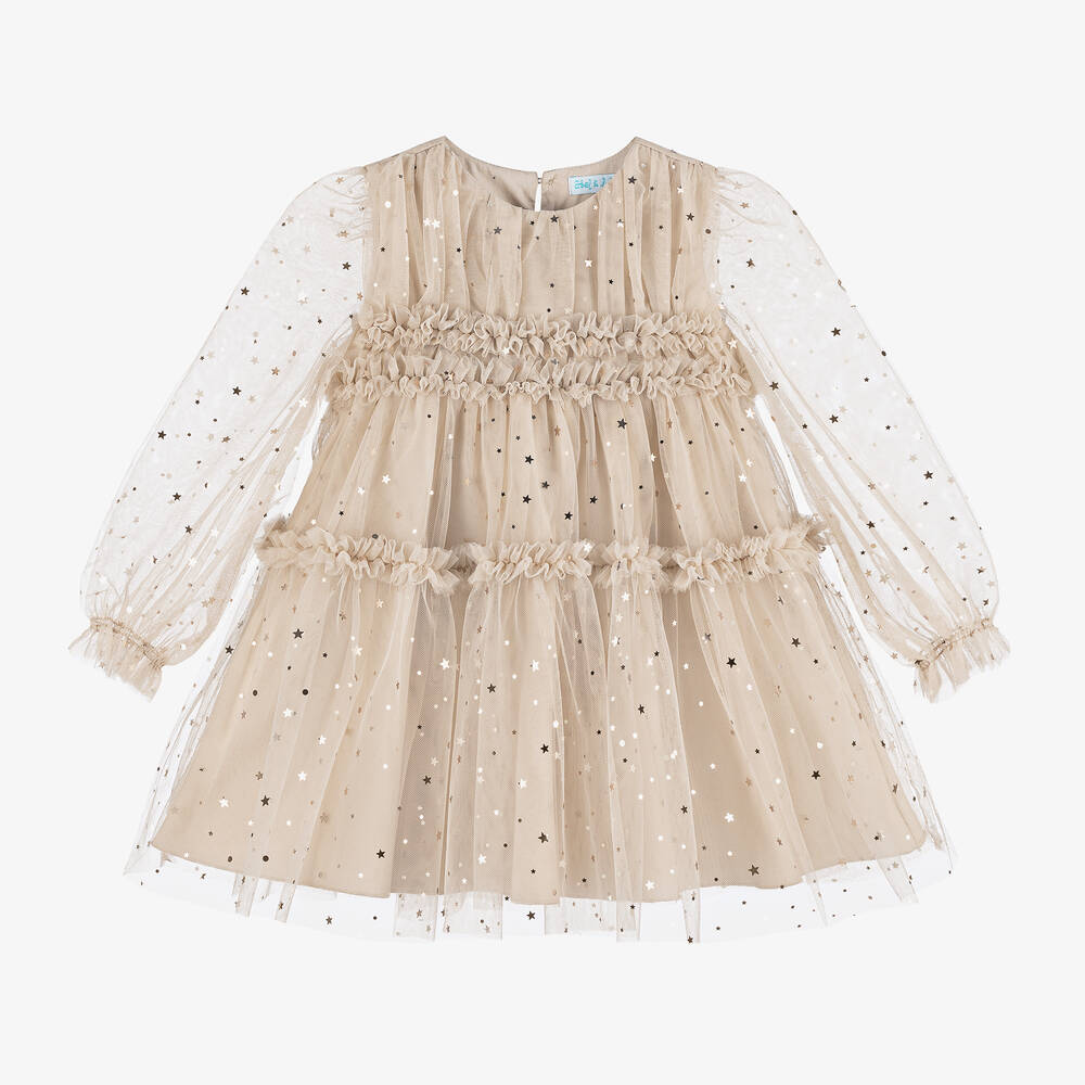 This beige special occasion dress for girls is by Spanish brand Abel & Lula. Ideal for a party, it is made in layers of soft tulle, trimmed with pretty ruffles and sparkling with shiny gold stars and dots. Lined in soft cotton for comfort, the dress has prettily puffed, sheer sleeves and fastens with gold-tone star buttons on the back.