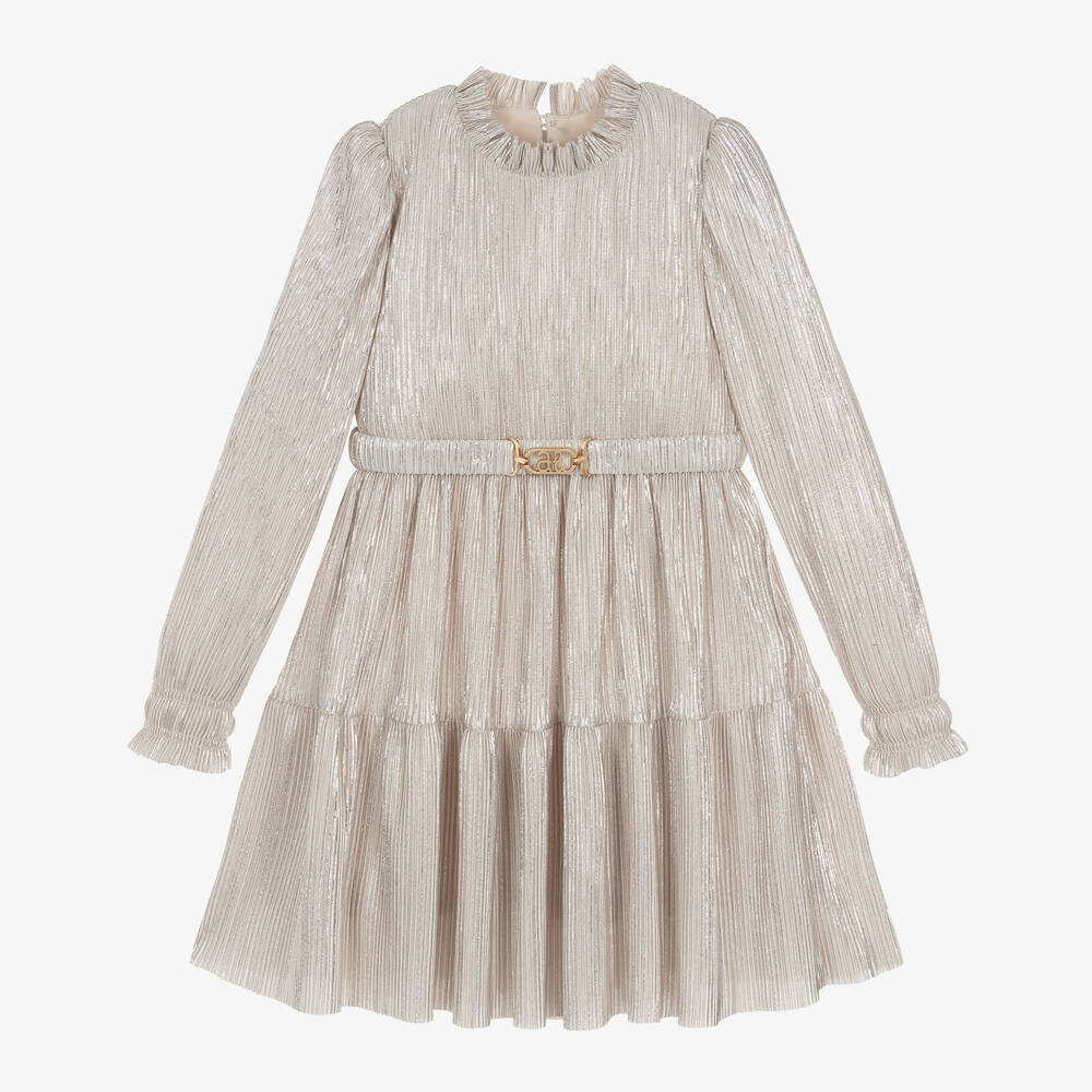 Beige, with a shiny silver stripe, this special occasion dress for girls is by Spanish brand Abel & Lula. Made in lightweight plissé with a shimmer, it has a elegant puffed sleeves, ruffled trims and a tiered skirt. The elasticated belt is detachable, adjustable and popper-fastening, and is finished with a shiny gold-tone logo plate at the front.The dress is lined in stretchy jersey for comfort and has a keyhole button fastening on the back.