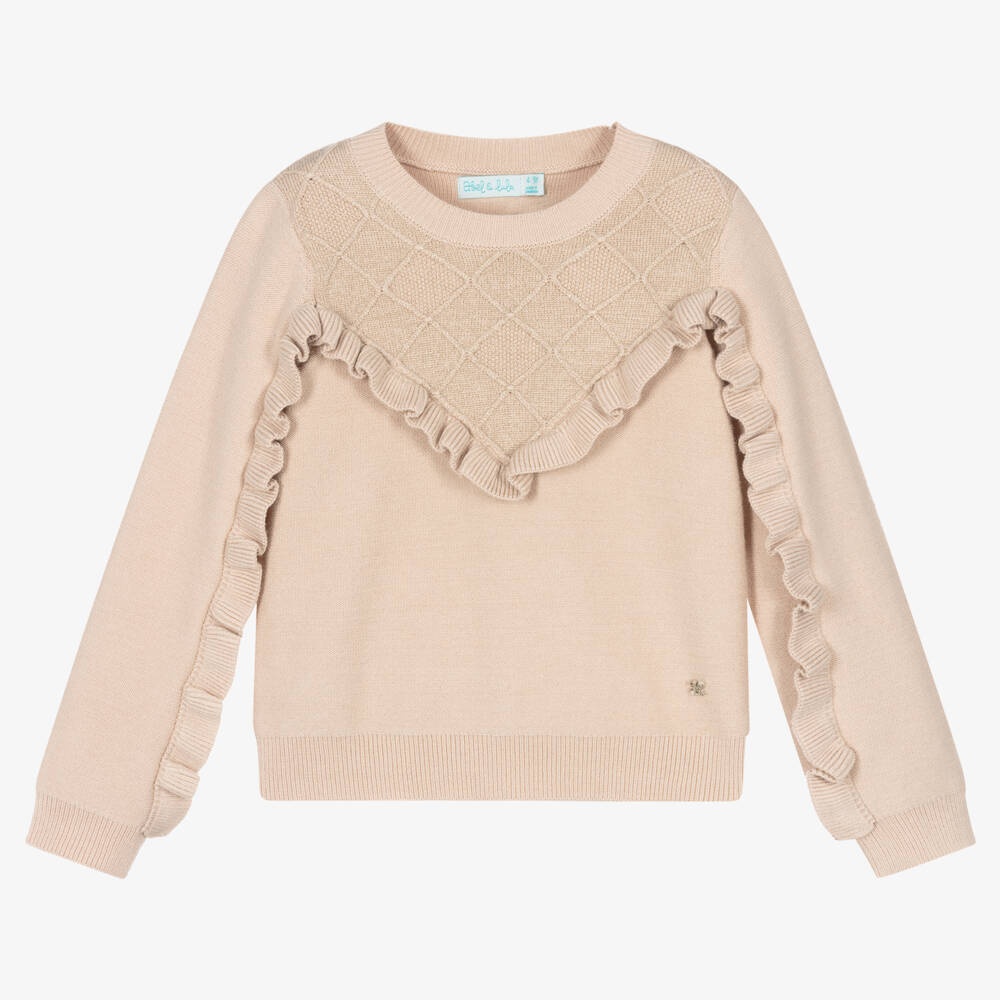 Beige sweater for girls by Abel & Lula, knitted in a soft, viscose blend. It has a pretty diamond pattern on the chest, with glittery gold detailing. There is a ruffle trim on the front and down the sleeves and a silver metal logo by the hem. Comfortable to wear, it has cosy ribbed trims.