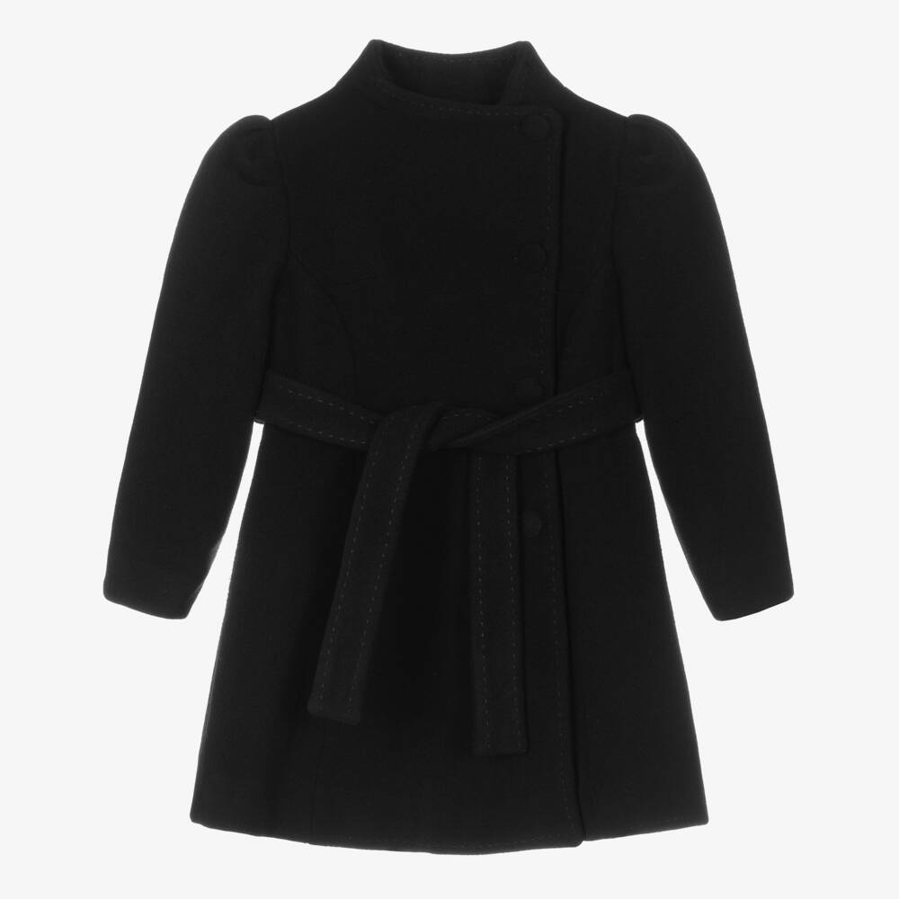 Stylish long black coat for girls by Abel & Lula, made in a soft virgin wool blend. Collarless, it has an elegant A-line shape and puffed sleeves, with off-centre button fastenings on the front. The silky lining is patterned with discreet logos and there are concealed pockets in the side seams. The tie belt is removable and has a gold metal logo on the back for a subtle designer finish.