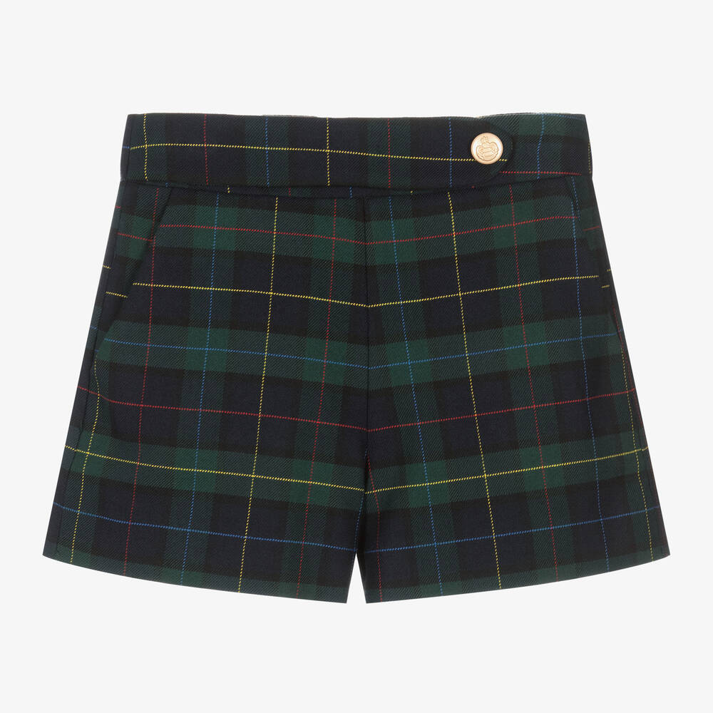 In navy blue and green tartan, these smart shorts for girls by Abel & Lula, are made in a soft viscose blend. Fully lined in lightweight cotton, they are styled with useful slanted front pockets and fasten with a zip on the back. The waistband can be adjusted for an ideal fit and has a decorative, gold-tone button on the front.