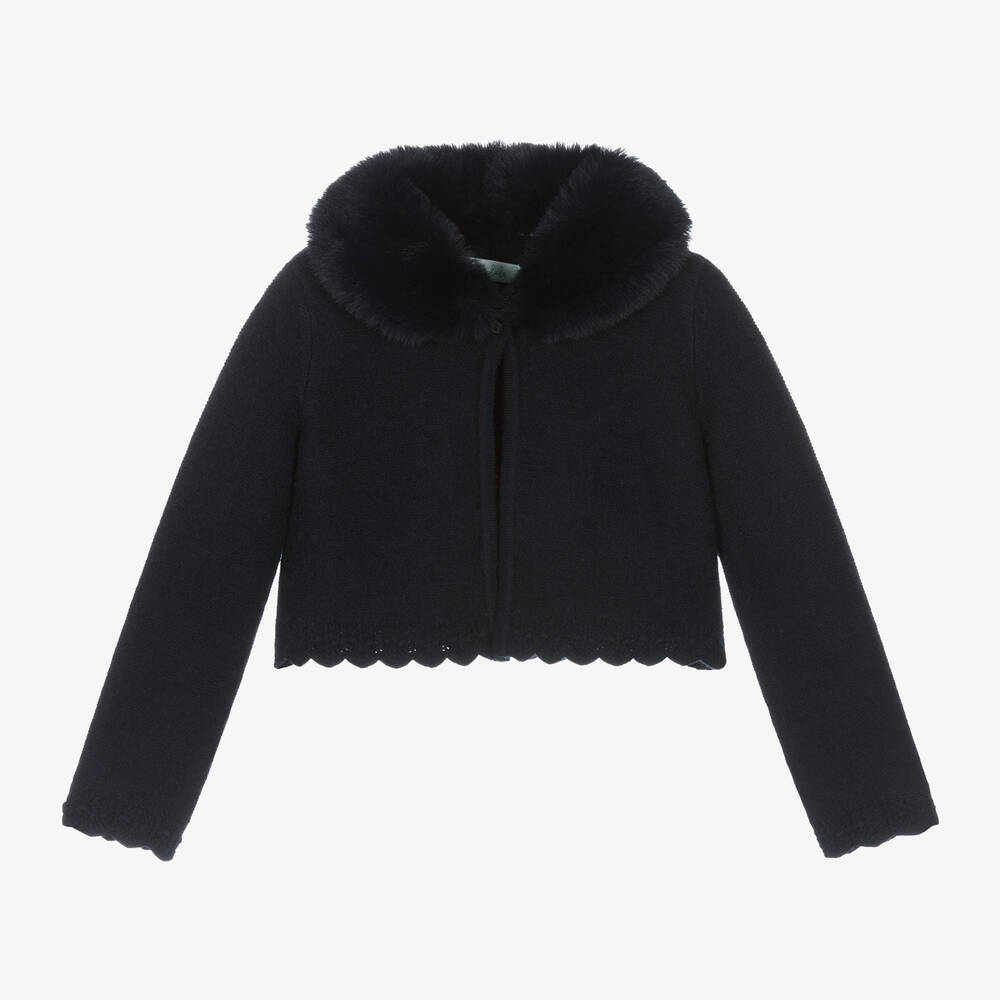 Lovely navy blue knitted cardigan for girls by Abel & Lula, fastening with a single button on the front. It has an elegant plush collar which can be fully detached with buttons for an alternate look. There is sweet scalloped edging on the hem and the cuffs.