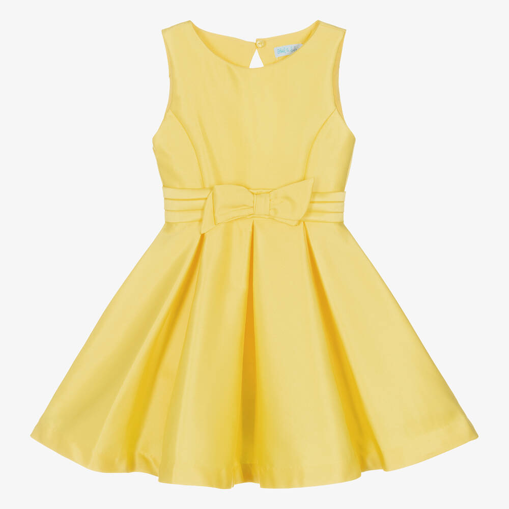 Lovely bright yellow sleeveless dress for girls by Abel & Lula, made in soft, smooth satin twill. Elegant and stylish, the skirt has box pleats to give a full effect and there is a removable pleated belt with a pretty bow on the front. It has a lightweight cotton lining, with a tulle layer for added volume in the skirt. There is a chic diamond-shaped open back, with a button and concealed zip fastening.