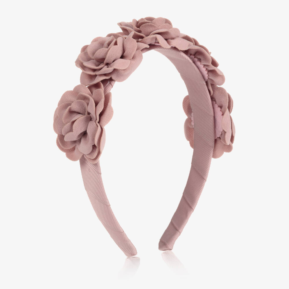 Girls pink floral hairband by Abel & Lula. In a lovely shade of dusky pink, this pretty hair accessory has a grosgrain ribbon-covered flexible band and is decorated across the top with fabric flower appliqués.