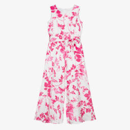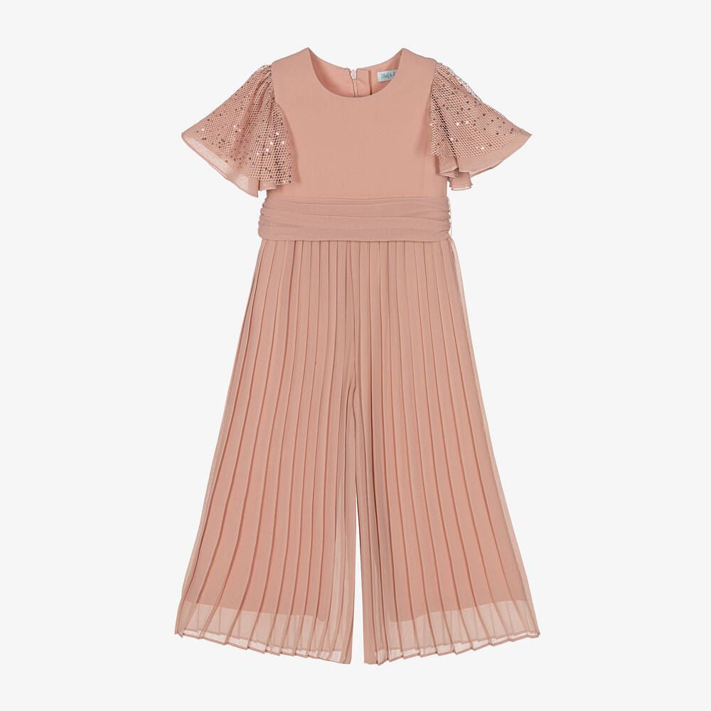 Stunning dusky pink jumpsuit for girls from Abel & Lula, made in soft lightweight chiffon, with a lightweight lining. It has gorgeous flutter sleeves layered with sequin embellished mesh and wide-leg pleated palazzo trousers. A concealed zip on the back makes dressing easier and a removable sash belt ties in a bow around the back for a pretty finish.