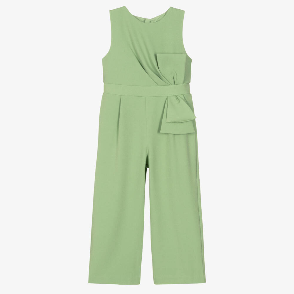 Chic green jumpsuit for girls by Abel & Lula. Lovely for a smart occasion, this sleeveless design is made in textured crêpe with stylish gathers and a bow detail on the front. The bodice has a lightweight viscose lining for comfort and the jumpsuit fastens neatly with a concealed zip on the back.