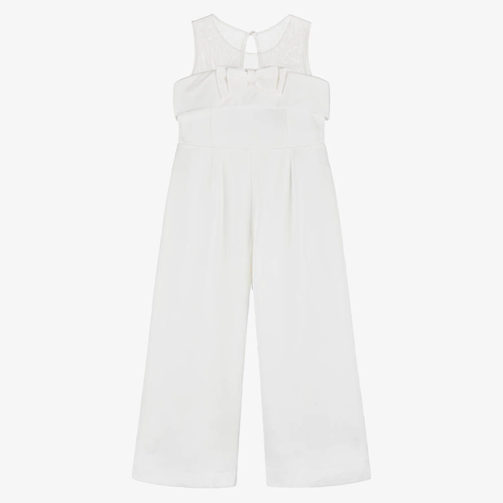 A chic ivory jumpsuit for girls by Abel & Lula, made in silky soft crêpe satin. Lovely for a special occasion, this elegant, wide-leg style is detailed in the front with a pretty bow. It has a sheer tulle panel across the top and shoulders and a soft viscose lining for comfort. For a neat finish there is a concealed zip and button fastening on the back.