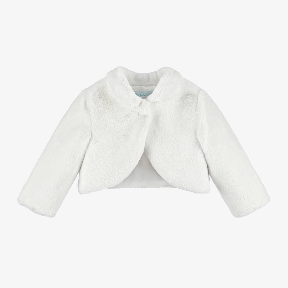 A stylish ivory jacket for little girls by Abel & Lula. Made from soft and cosy faux fur, it has a silky lining and a sweet rounded collar. In a cropped style, the hemline curves upwards at the front and there is a concealed popper fastening at the neckline.