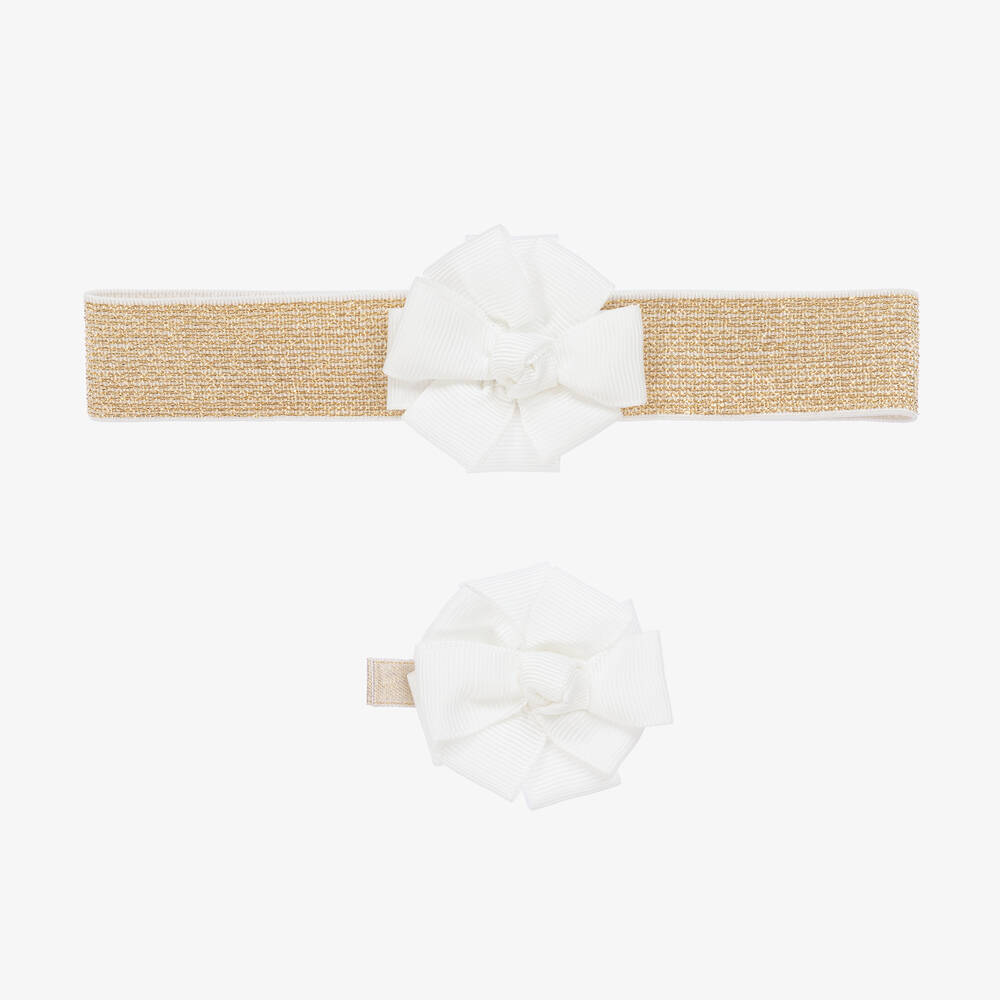 A sweet headband and hair clip for girls by Abel & Lula, in glittering gold and ivory. Both decorated with a grosgrain ribbon flower, the hair clip is lined in rubber to ensure it stays in place and the headband is elasticated for a great fit.