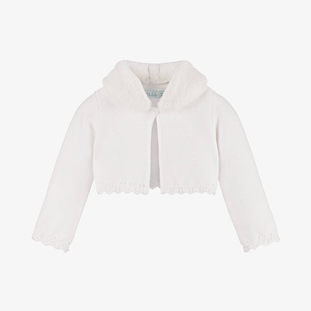 A delightful ivory cardigan for little girls by Abel & Lula. Knitted in a soft viscose blend, it has a cosy faux fur collar that detaches with buttons for a different look. There are sweet scalloped trims on the cuffs and hemline, and a single branded button fastening on the front.