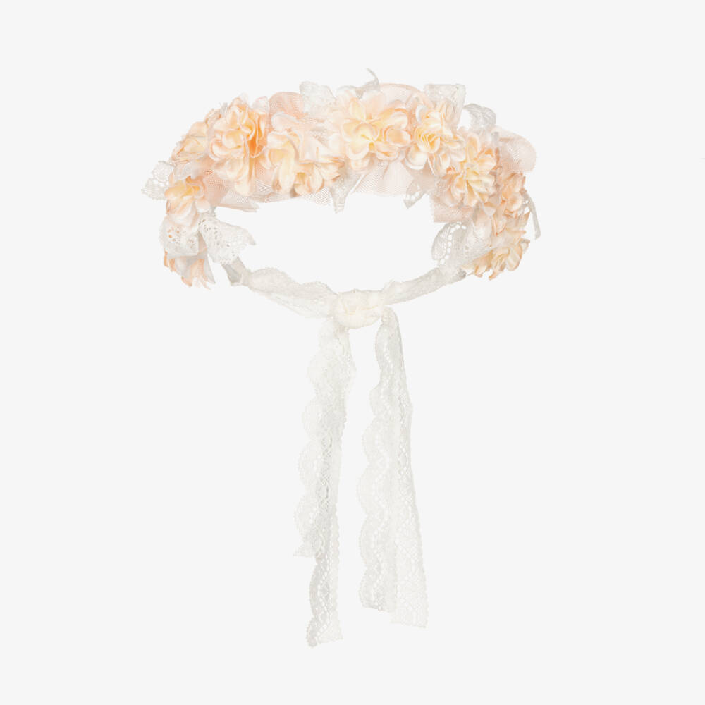 A lovely orange and white hairband for girls by Spanish brand Abel & Lula. The flexible band is covered in grosgrain ribbon and decorated with pale orange flowers on the top. Vintage-inspired, it is finished with delicate lace and tulle trims, and additional lace ties to help secure the accessory to the head.