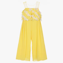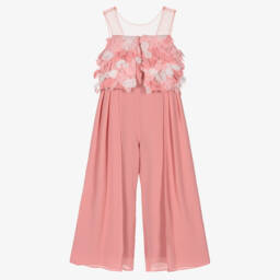 This elegant, pale pink jumpsuit for girls by Abel & Lula is ideal for special occasions. Made in lightweight crêpe, it features sheer mesh straps and a delicate overlay of pink and white petals on the bodice. Lined for comfort, the wide cut legs are pleated on the front, creating a stylish silhouette.