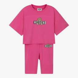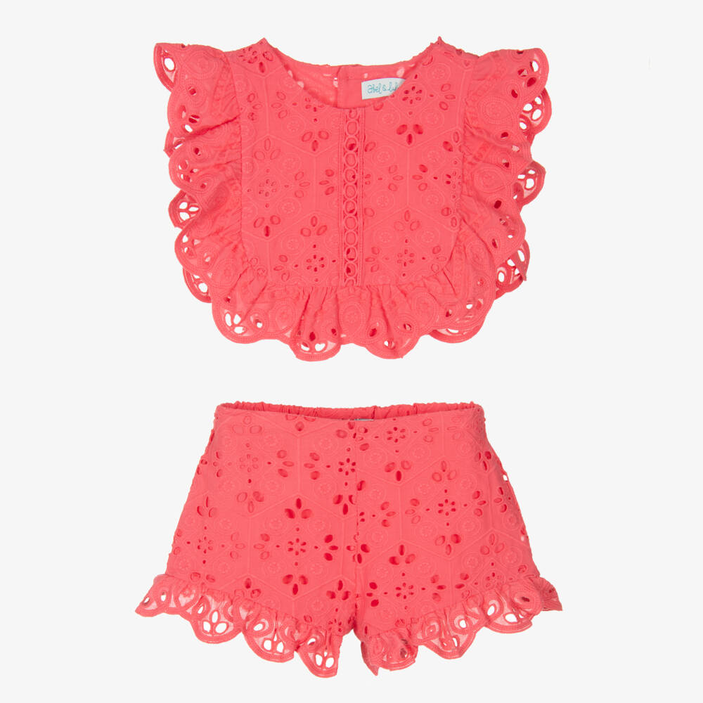 Lovely fuchsia pink broderie anglaise shorts set for little girls by Abel & Lula, made in soft cotton. Both pieces are lined and have pretty scalloped-edge trims. The top has open sides with ties and there are button fastenings on the back. The shorts have a partly elasticated waist for a comfortable fit.