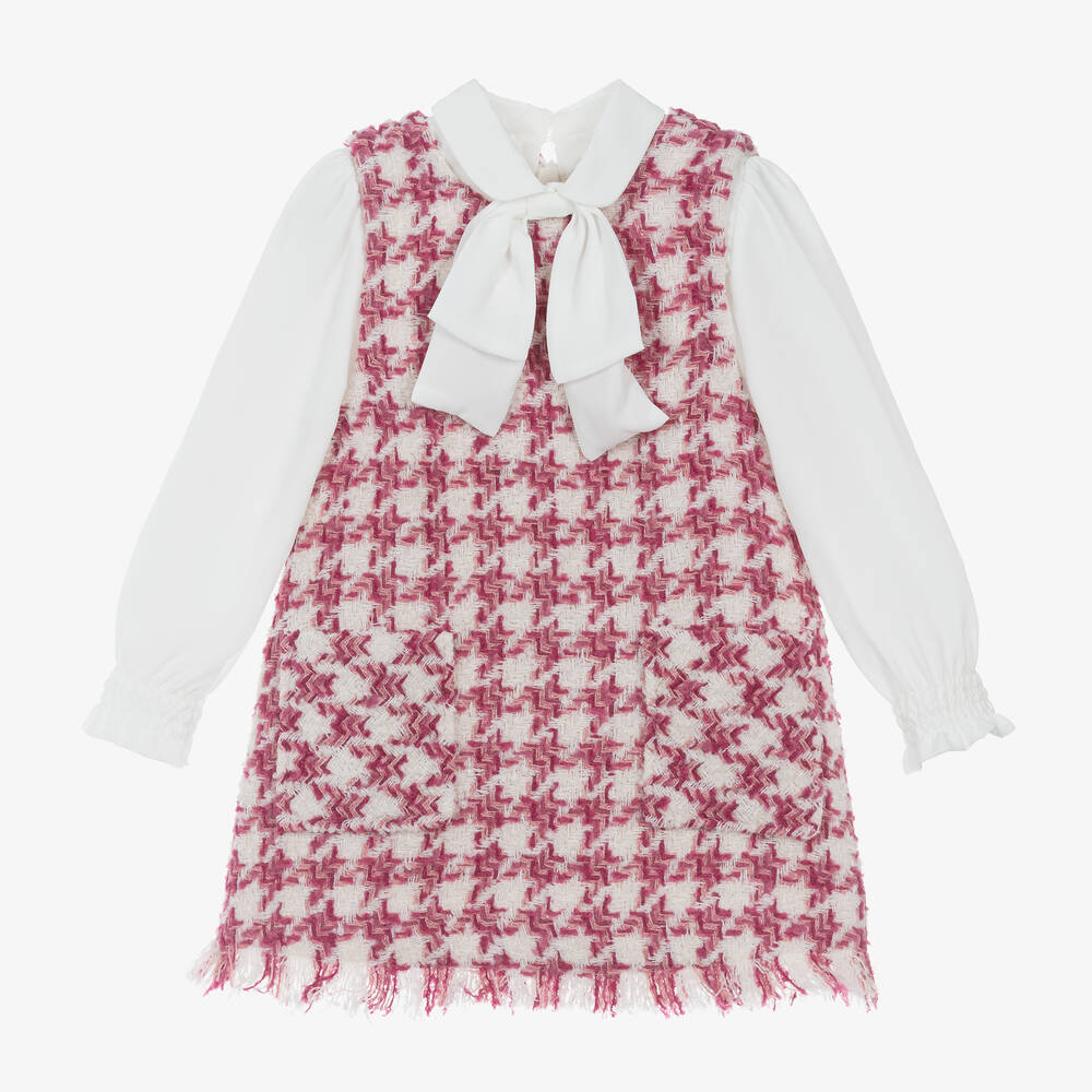 Lovely and chic pink and ivory A-line dress for girls by Spanish brand Abel & Lula. It is made in a wool blend tweed with shimmery pink thread in the weave, a fringed hemline and two patch pockets. The simple yet elegant design resembles a layered pinafore style, with an ivory crêpe blouse insert, a fixed bow under the rounded collar and flowy long sleeves. Lined in soft cotton for comfort, it fastens with buttons and a concealed zip on the back.