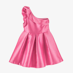 In a vibrant shade of pink, a beautiful special occasion dress for girls by Abel & Lula. Made in lustrous satin twill, this elegant one-shoulder design has a pretty ruffle trim and a full pleated skirt. It is lined in lightweight cotton for comfort, with a concealed side zip fastening for a neat finish.
