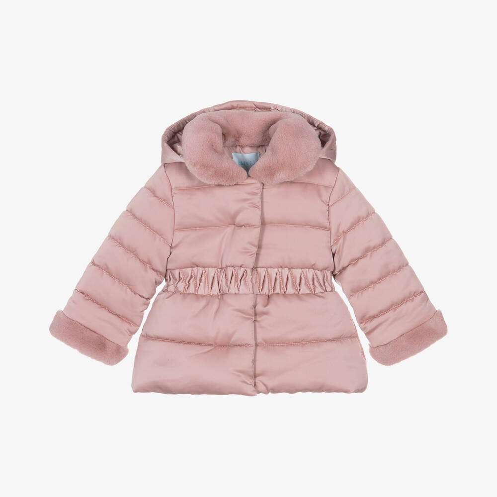 A pink puffer jacket for little girls by Abel & Lula. Super smooth with a lovely sheen, this mid-weight padded jacket is lined with soft faux fur. Fastening with a concealed zip and poppers on the front, it has a faux fur collar and cuffs for added cosiness and a hood that detaches with poppers for an alternative look. An elasticated panel defines the waist and ensures a comfortable fit.