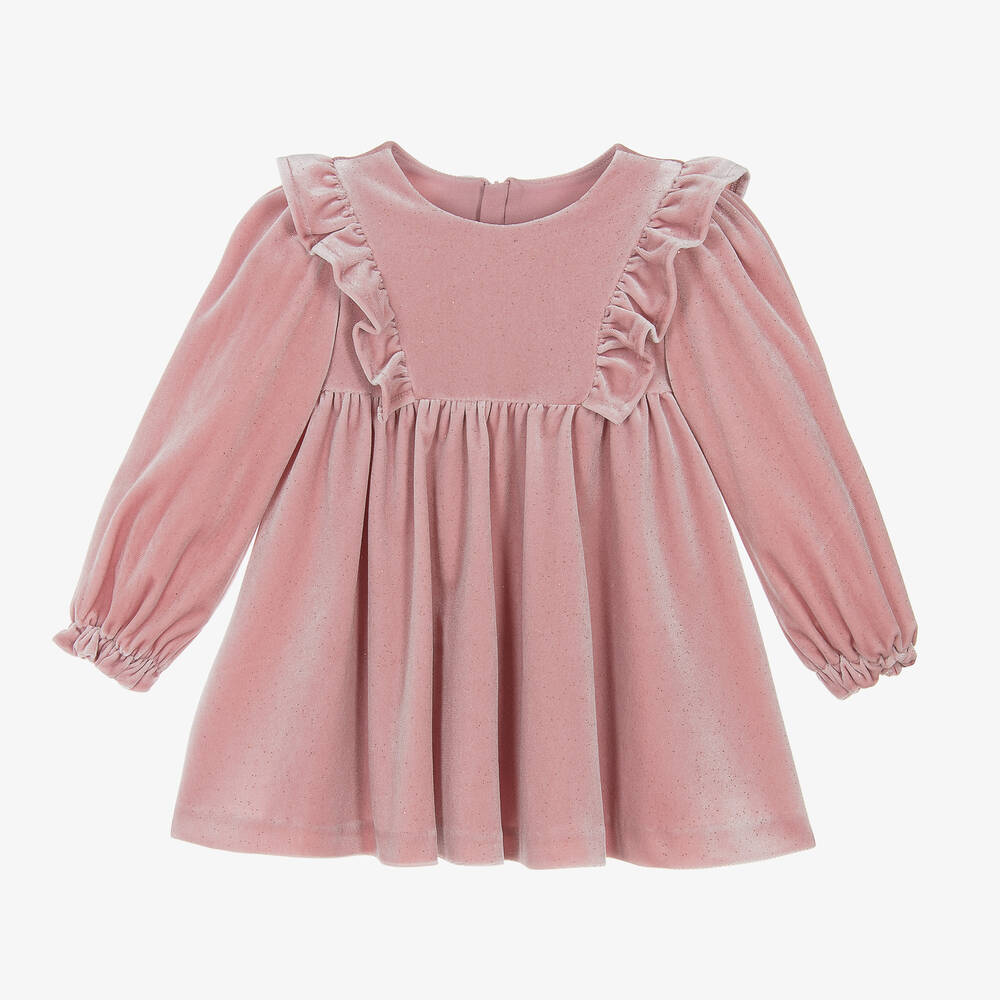 A lovely pink long-sleeved dress for little girls by Abel & Lula. Made from soft velour sprinkled with gold sparkles, it has a smooth and lightweight viscose twill lining. Fastening with a concealed zip on the back, there is frilled detailing over the shoulders for a lovely finish.