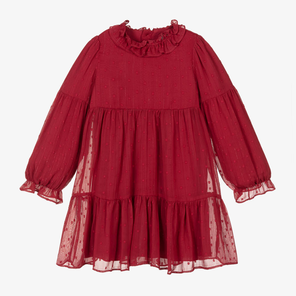 Deep red dress for girls by Abel & Lula, made in sheer, lightweight plumeti chiffon woven with sparkly silver threads. This pretty tiered dress has a ruffle collar and button fastenings on the back. It is fully lined in soft viscose for comfort.