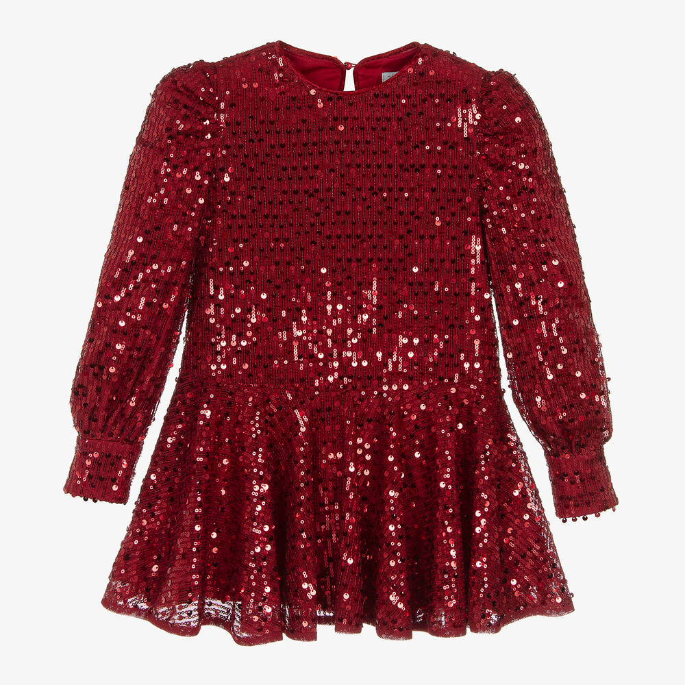 Lovely red dress for girls by Abel & Lula, made in soft, fine mesh decorated with sequins. Ideal for a special occasion, this sparkly dress has long puffed sleeves with beaded button fastenings on the cuffs and is fully lined for comfort. Cool and stylish, it has a dropped waist with a full skirt and fastens with a single beaded button on the back.