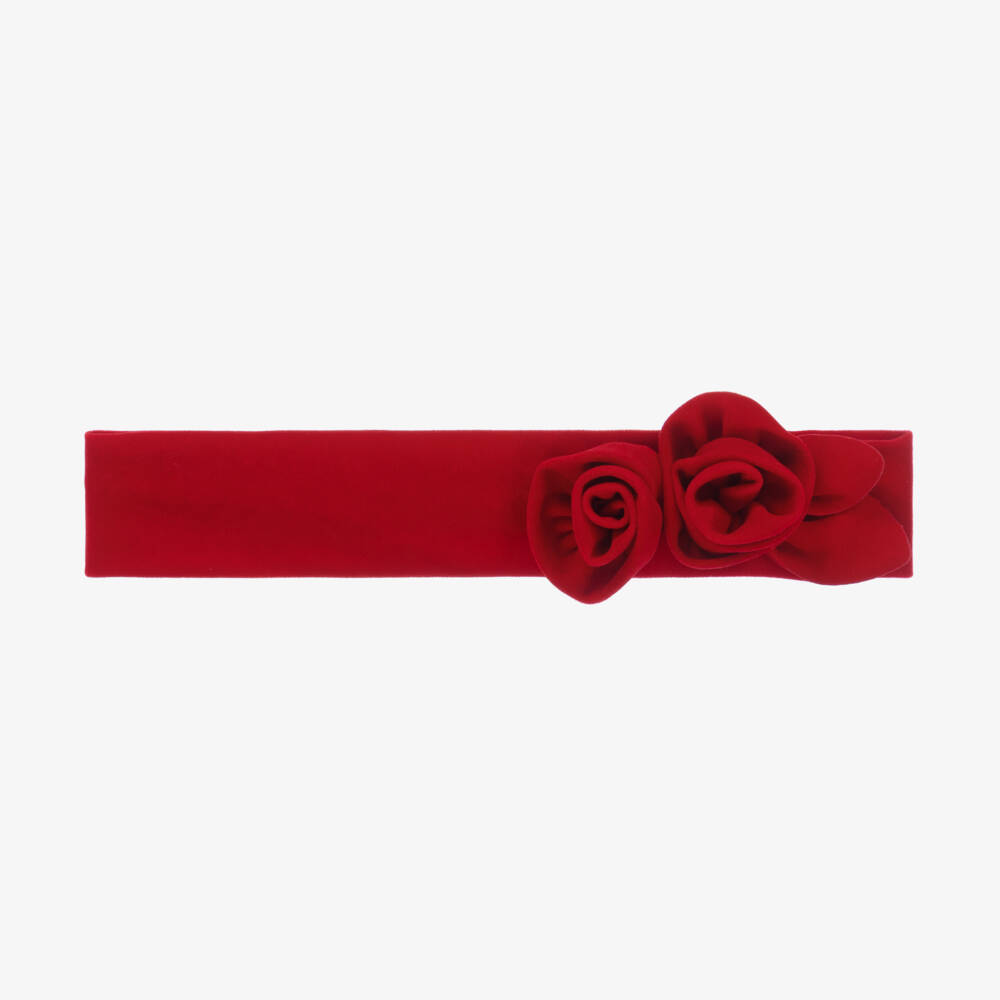 Sweet red velvet headband for girls by Abel & Lula, decorated with two lovely flowers. The soft and plush velvet band is elasticated on the back for a comfortable fit.