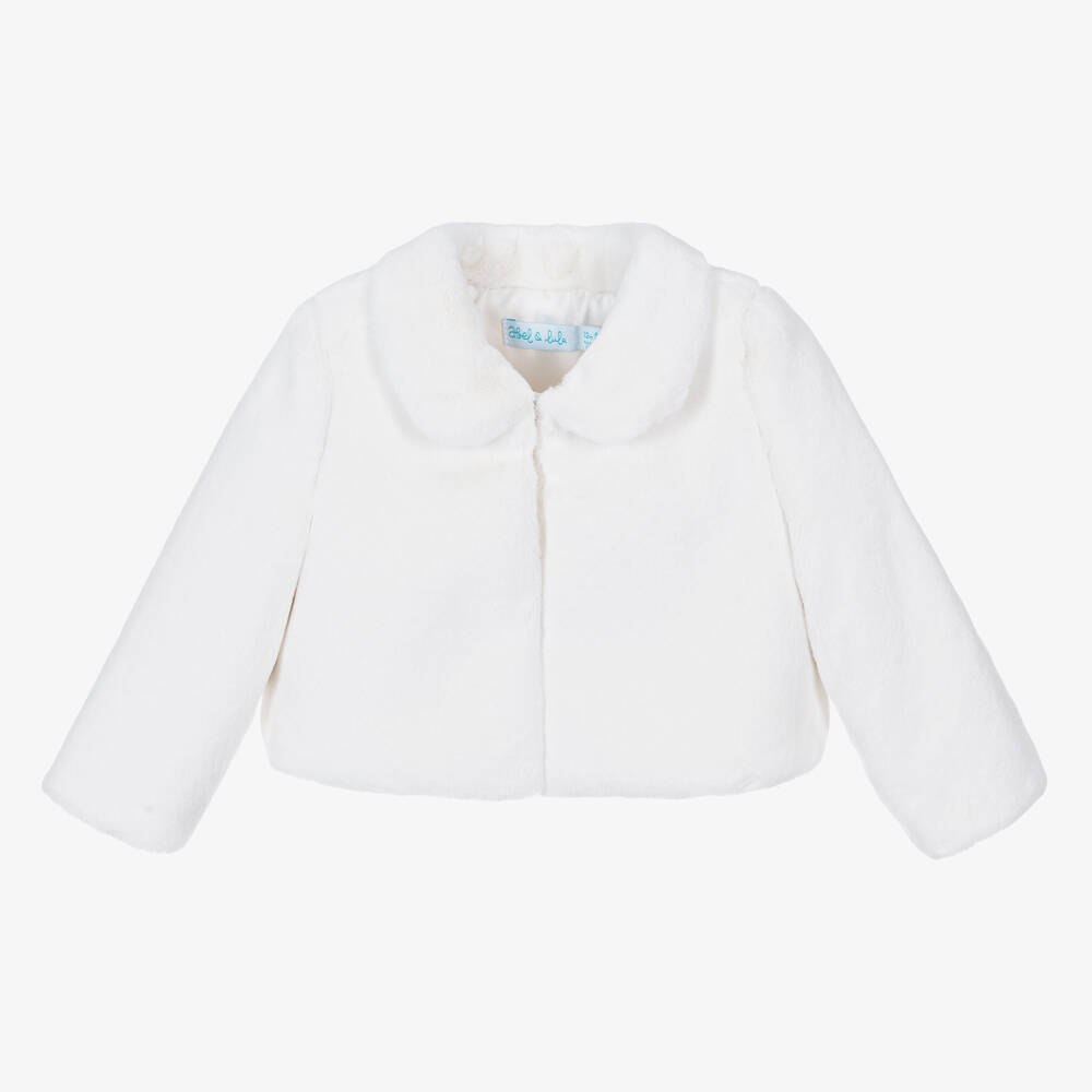 Gorgeous white jacket for little girls by Spanish brand Abel & Lula, made in beautifully soft faux fur. It fastens with concealed poppers on the front and is lined in white satin patterned with jacquard logos. It is ideal for special occasions or simply to make the every day a little less ordinary.