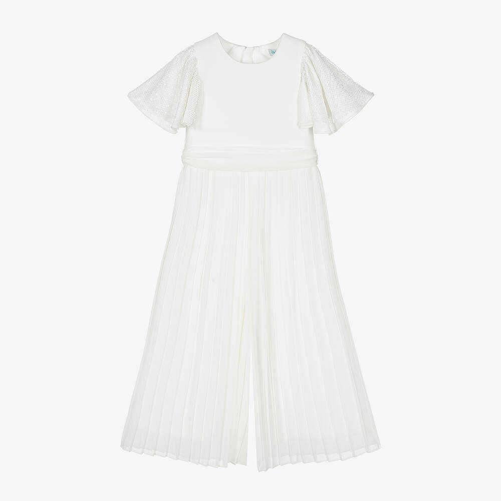 Stunning white jumpsuit for girls from Abel & Lula, made in soft lightweight chiffon, with a lightweight lining. It has gorgeous flutter sleeves layered with sequin embellished mesh and wide-leg pleated palazzo trousers. A concealed zip on the back makes dressing easier and a removable sash belt ties in a bow around the back for a pretty finish.
