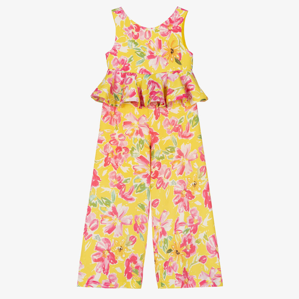 Bright yellow sleeveless jumpsuit for girls by Abel & Lula, made in soft, silky satin twill, with a colourful floral pattern. Elegant and chic, it has wide legs and a pretty ruffle trim around the waist. It is partially lined for comfort and has a concealed zip fastening on the back.