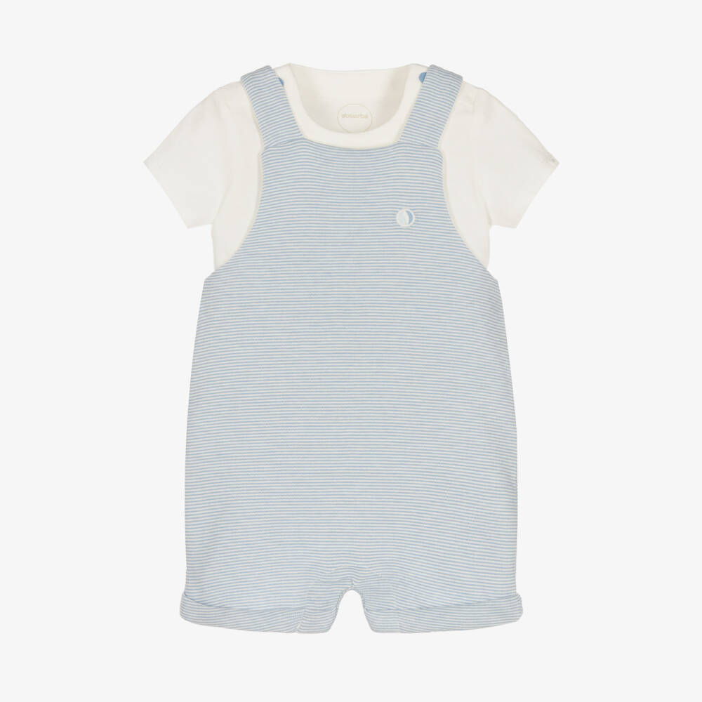 A cute top and dungaree set for baby boys by Absorba, made in soft and comfy organic cotton jersey. The white T-shirt has a popper fastening on each shoulder to help with dressing. The finely striped blue dungarees are fully lined, and have fixed shoulder straps which fasten with poppers to the back of the gently elasticated waist. There are useful popper fastenings between the legs to help with dressing.