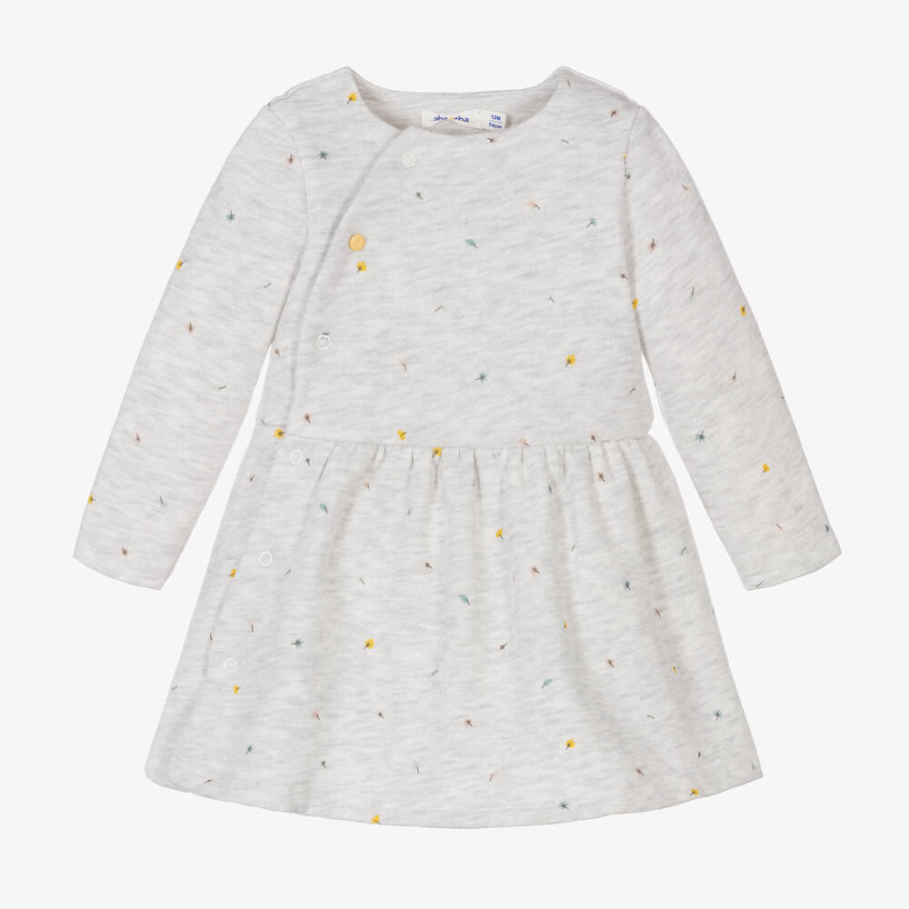 Sweet ecru and grey marled dress for baby girls by Absorba, with colourful little leaf pattern. Comfortable with a soft and fleecy inside, it is made from mid-weight cotton jersey for added cosiness. Easy and practical, it has front popper fastenings on one side.