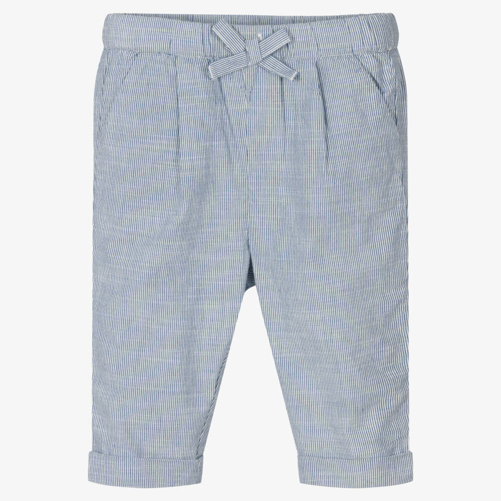 A pair of navy blue and white trousers for younger boys and girls by Absorba, with a faux drawstring waist. Designed with classic French styling, they have stripes woven within the soft organic Oxford cotton fabric. Darted for shape, they have three pockets, one of which is detailed with a small logo patch. The elasticated waist is adjustable with buttons for a good fit. Turn-up cuffs complete the smart-casual design.