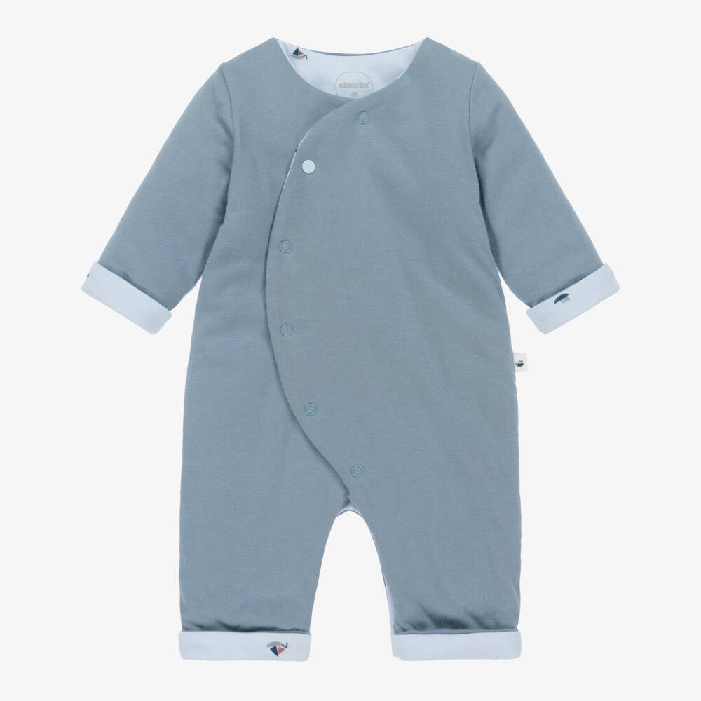 Deep blue pramsuit for baby boys by Absorba. Lightly padded and cosy, this soft and stretchy pramsuit is made and lined in comfortable organic cotton jersey, and has a pale blue lining, printed with little boats. It has a tab on one side with a matching little boat print, and asymmetric front popper fastenings.