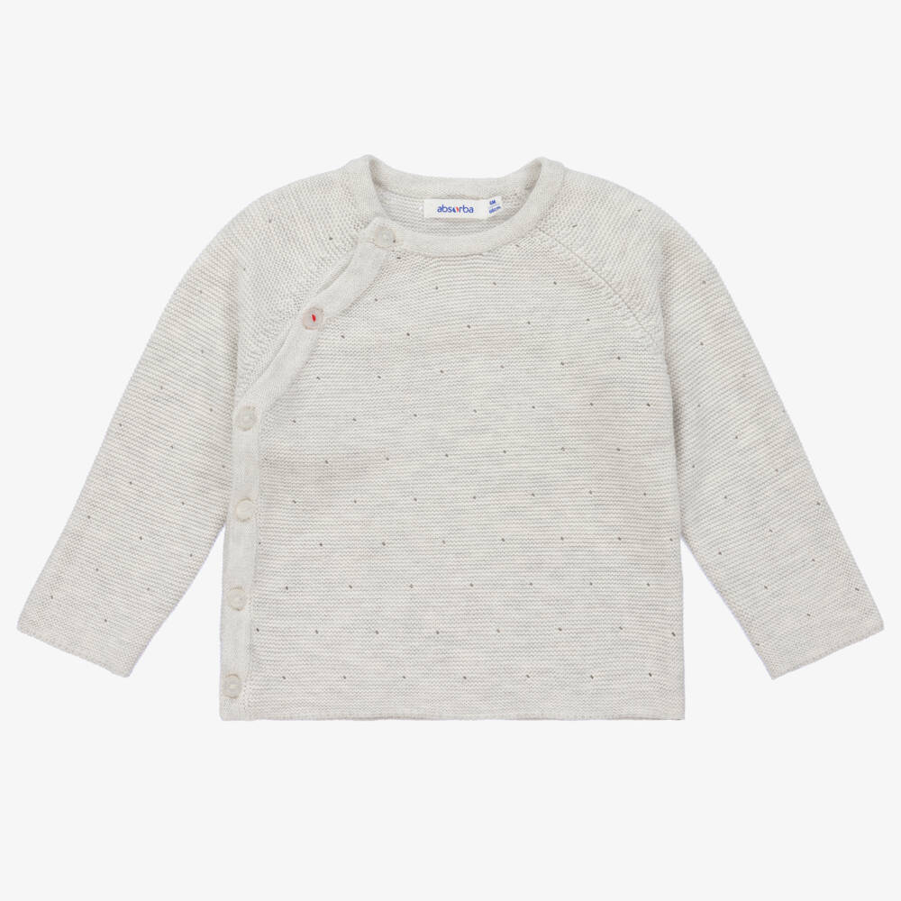 Light grey marl cardigan for baby boys and girls by Absorba, with an asymmetric button fastening. Cosy and comfortable, it is finely knitted in a soft cotton blend.