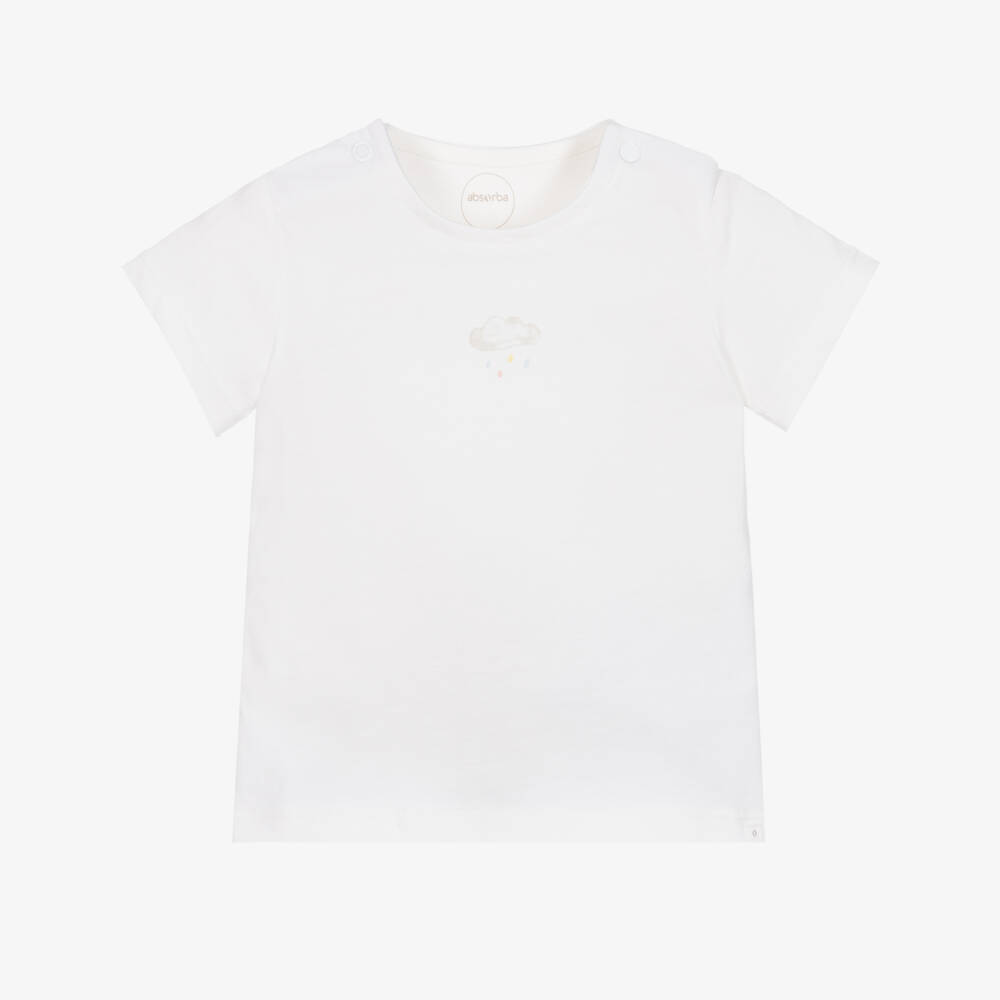 Pale ivory T-shirt for baby boys and girls by Absorba, made in soft and comfy organic cotton jersey. It has a sweet cloud motif on the front and easy-fastening poppers on one shoulder to help with dressing.