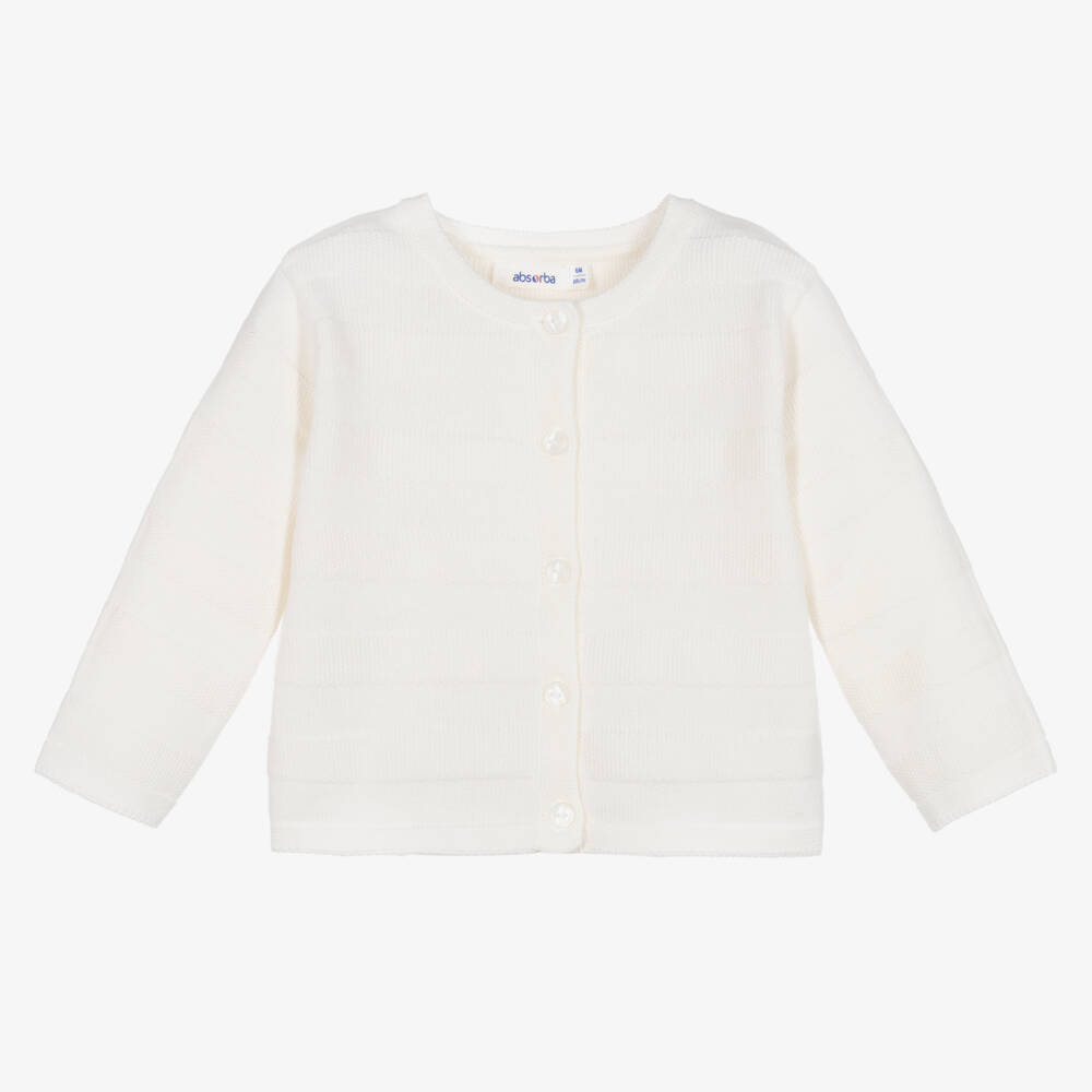 Pale ivory cardigan for little boys and girls by Absorba. Made in a soft cotton blend, the fabric is intricately knitted in seed stitches to create a jacquard-stripe effect. It fastens with shimmering pearlescent buttons for a timeless look.