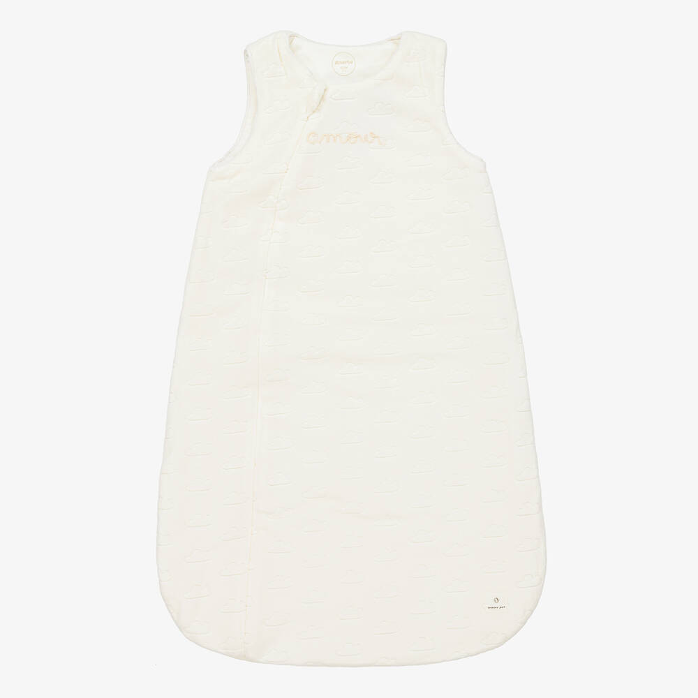 Lovely ivory sleeping bag for baby boys and girls from Absorba, with 'amour' appliqued in darker ivory on the front. Made from organic cotton and lightly padded, the super soft velour exterior has textured, little cloud pattern and a lightweight jersey lining for comfort. Easy to slip into, it has an invisible zip fastening from the chin down to the base, with a chin guard to protect against rubbing.