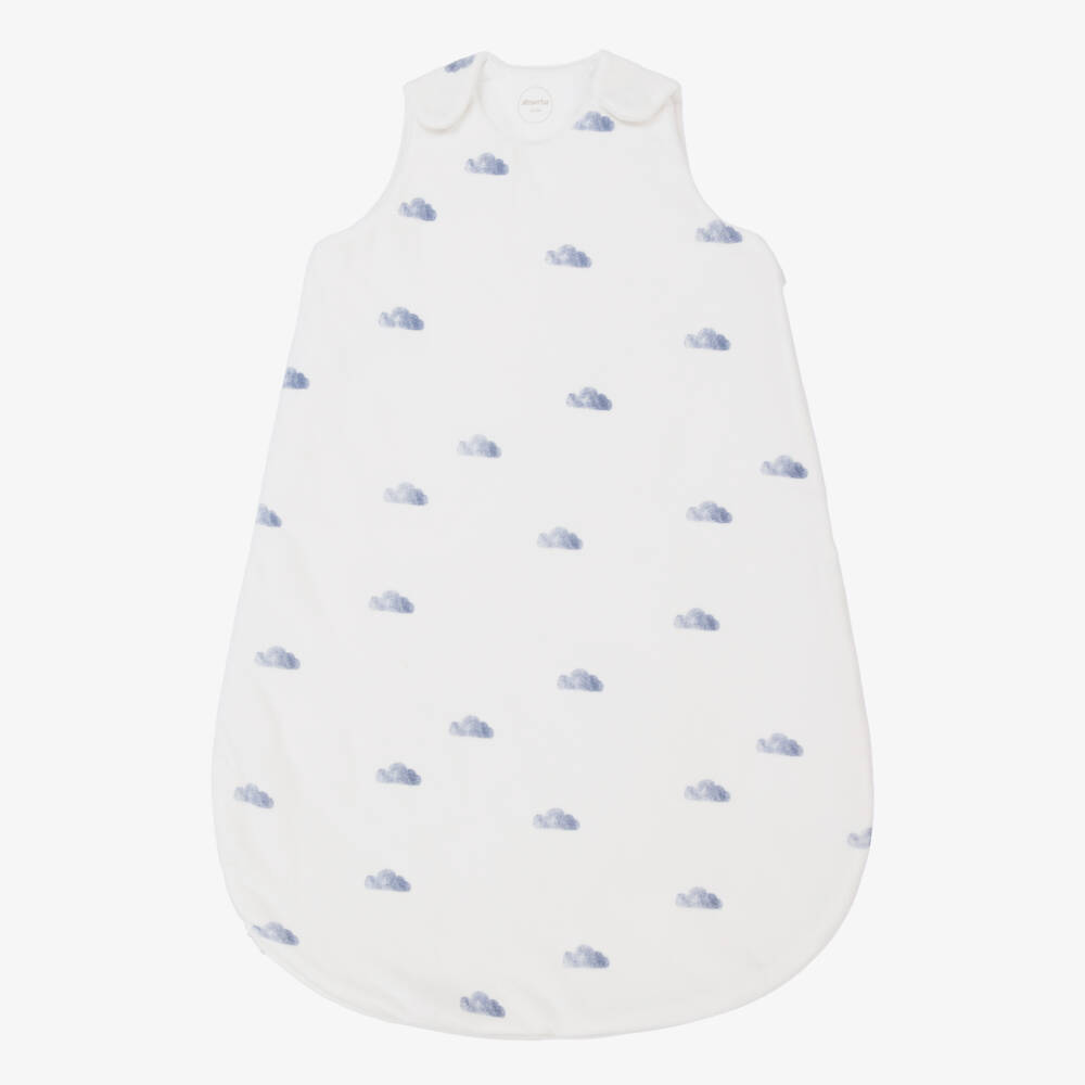 White velour sleeping bag for baby boys and girls from French brand Absorba, with a lovely watercolour-effect cloud print in deep blue. It is lightly padded, with a 2.5 tog rating for cosiness and adjustable popper-fastening shoulder straps for the ideal fit. Made in a cotton mix, it has a beautifully soft cotton jersey lining for baby's comfort. Easy to slip into, it has a zip to fasten along the side to the base, with a guard at the top to protect their delicate skin. This item contains organic cotton.