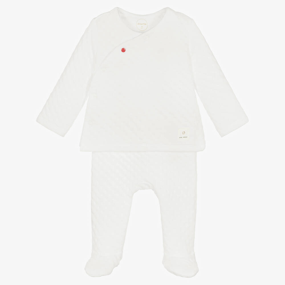Cosy white two piece babygrow for boys and girls by French brand Absorba. Super comfortable, it is made in a double layer of cotton-blend jersey with a quilted effect. The top fastens on one side with easy-to-use poppers, one accented in red with an embossed logo. The bottom part has a ribbed, fold-over waistband, which is gentle on little tummies and can be turned over as baby grows.