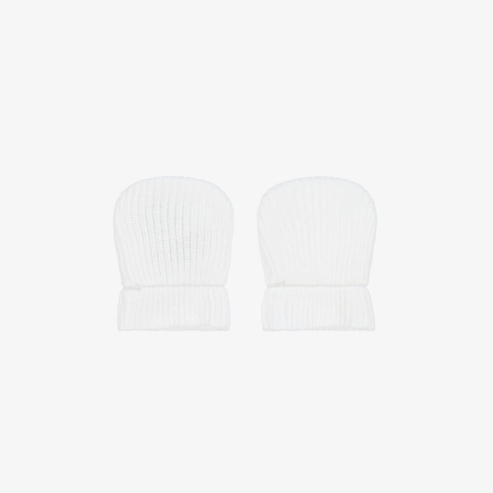 Off-white scratch mittens for baby boys and girls by Absorba, made in a softly ribbed cotton knit. Comfortable to wear, they will help protect baby from scratching their delicate skin.