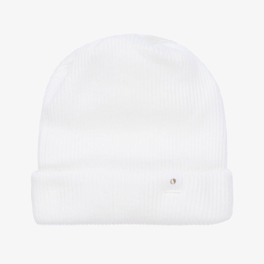 White layette hat for baby boys and girls by Absorba, made in ribbed cotton jersey. Beautifully soft, it has a turned-up brim with a small embroidered logo badge.