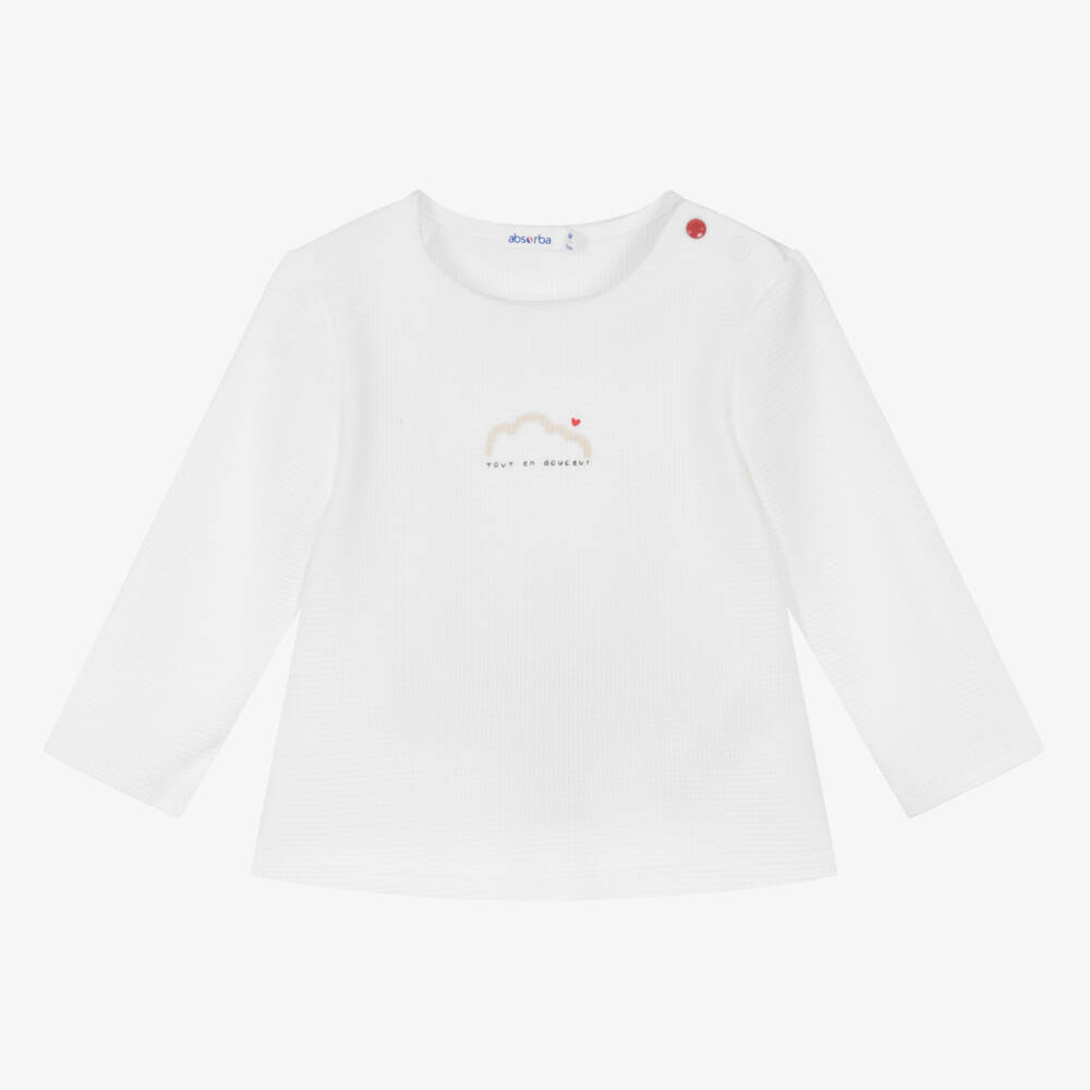 White organic cotton top for baby boys and girls by Absorba, made in a soft and stretchy waffle knit. It has a sweet beige cloud, red heart, and the French words, 'tout en douceur' on the front, meaning 'with a soft touch'. It fastens with poppers on one shoulder, one of which is red to add a subtle splash of colour.